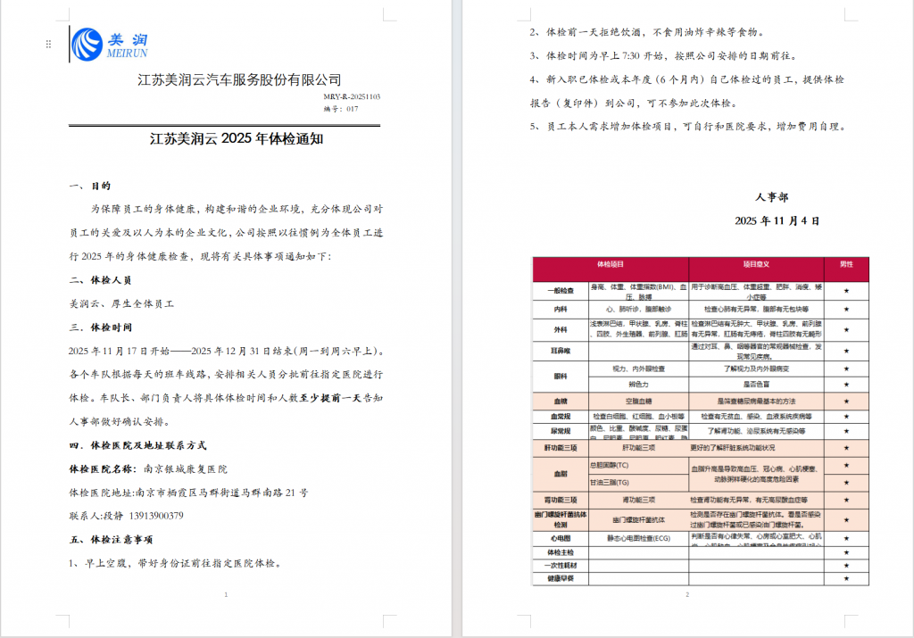 体检周期为 2025 年 11 月 17 日至 2025 年 12 月 31 日(周一至周六上午),公司将按各车队班车线路统筹规划,分批次组织员工前往指定医院体检。车队长及部门负责人需提前 1 天向人事部确认当日体检人数及具体时间,确保体检工作有序推进。
