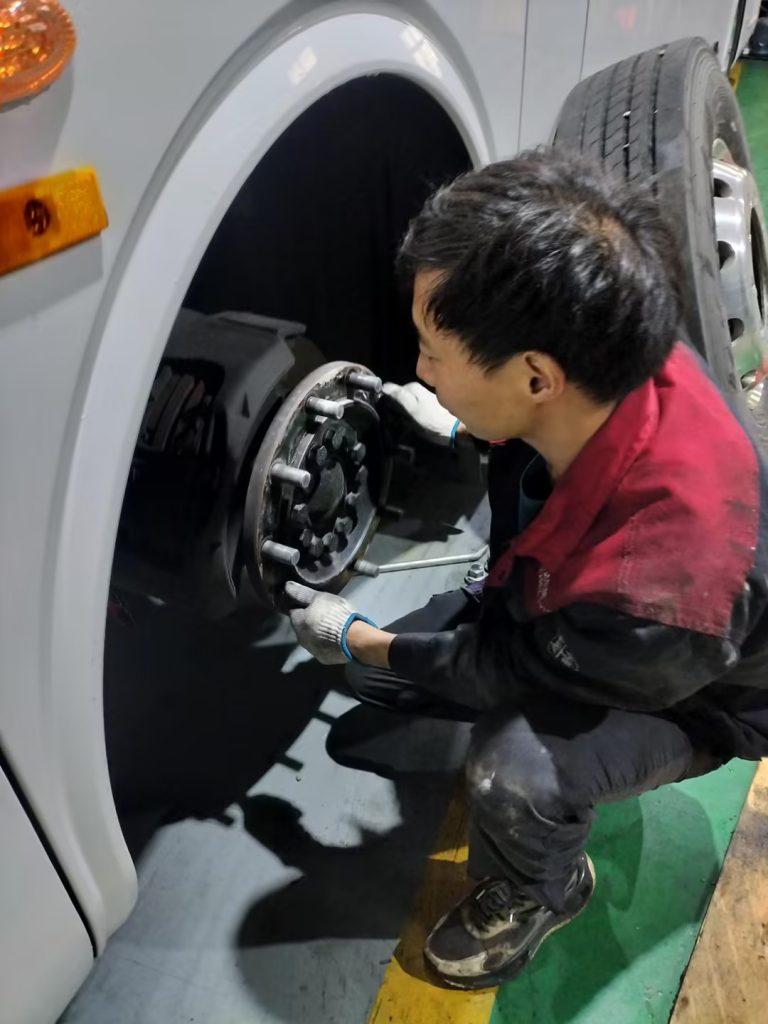 保养人员采用举升设备将车辆升起,对底盘进行全方位细致排查:重点检查底盘车架有无锈蚀、变形或裂缝,传动轴、悬挂系统连接部位是否牢固,管线有无老化渗漏;同时逐一检查轮毂轴承松紧度、轮胎胎压与磨损情况,紧固轮毂螺栓,清理胎面杂物,确保车辆行驶过程中底盘稳定、轮毂运转正常,避免因部件松动或轮胎问题引发安全事故。