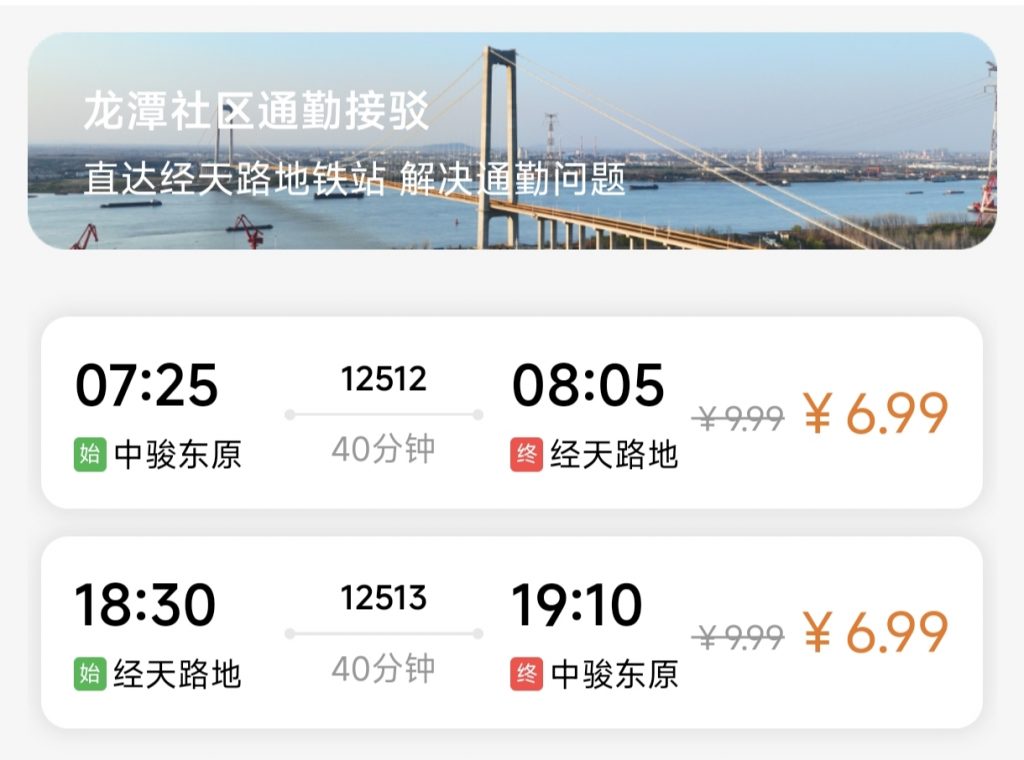 为切实解决龙潭片区居民通勤出行难题,完善区域轨道交通接驳网络,顺巴出行龙潭通勤班线完成各项筹备工作,定于4 月 1 日正式开通。班线从小区直达仙林湖地铁站、经天路地铁站,精准匹配日常通勤出行需求,首末班车时间固定,为沿线居民打造高效、便捷的通勤出行体验。